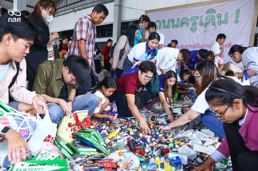 แล้วระหว่างที่เสียงจากเวทีเสวนาเคลื่อนขบวนความร่วมมือ ‘All For Education – Education For All: การกระจายทรัพยากรการศึกษาเพื่อโรงเรียนพื้นที่ห่างไกล’ เริ่มเคลื่อนไหวที่อีกฟากฝั่งของโรงเรียน เสียงสัญญาณนับจาก 10 ถึง 0 ก็เสร็จสิ้น บ่งบอกว่าถนนครูเดินครั้งที่ 1 จังหวัดเชียงรายได้เปิดขึ้นแล้วอย่างเป็นทางการ เมื่อนั้นคุณครูจึงทยอยกันเข้าไปเลือกสิ่งของที่เรียงรายจนเต็มพื้นที่อาคาร ตั้งแต่ชุดนักเรียน อุปกรณ์การเรียน รองเท้า กระเป๋า หนังสือ อุปกรณ์กีฬา สื่อการสอน ถ้วยชามจานช้อน เครื่องดนตรี แฟ้มเอกสาร คลิปหนีบกระดาษ ดินสอสี สีน้ำ ชอล์ก พู่กัน จานสี ฯลฯ ไปจนถึงของเล่นเสริมพัฒนาการต่าง ๆ ด้วยหมายใจจะนำสิ่งขาดแคลนไปเติมเต็มความขาดพร่อง ณ โรงเรียนบนดอยสูง ซึ่งอยู่ไกลแสนไกลจากโอกาส